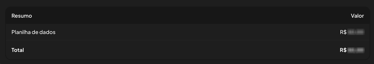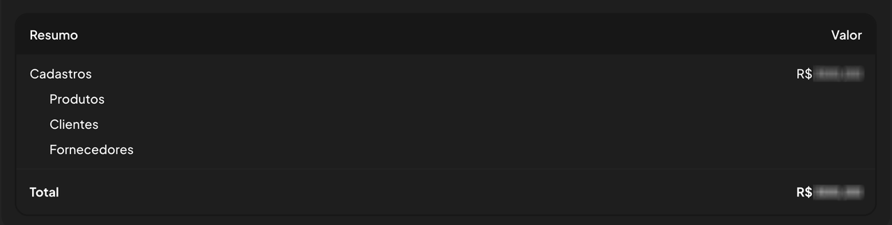 Ao final da página é possível observar um resumo do valor total da importação.