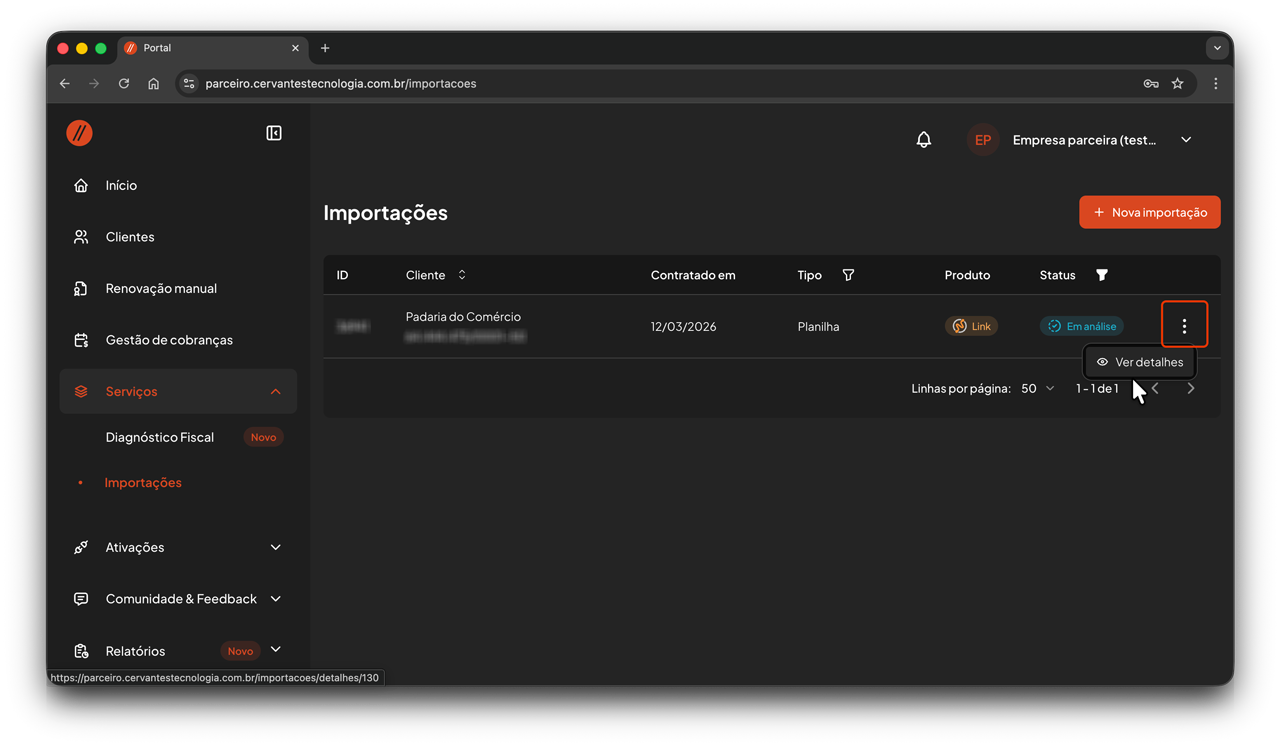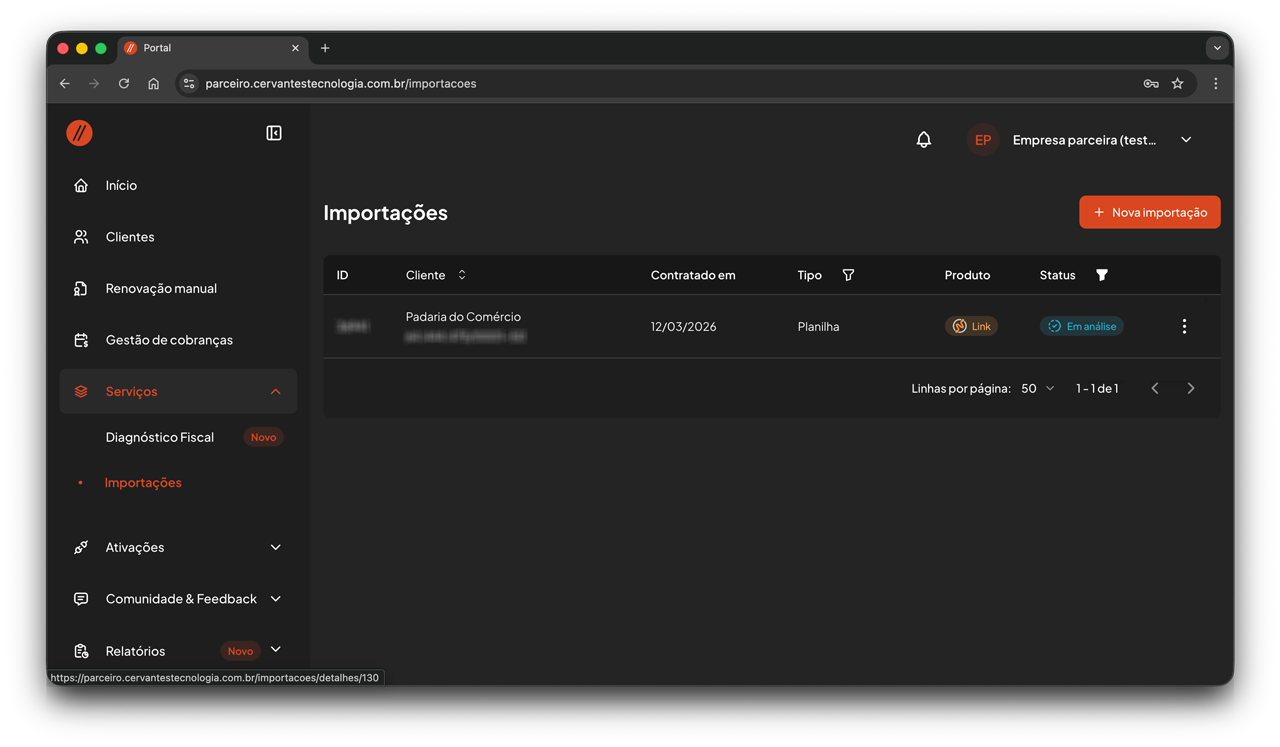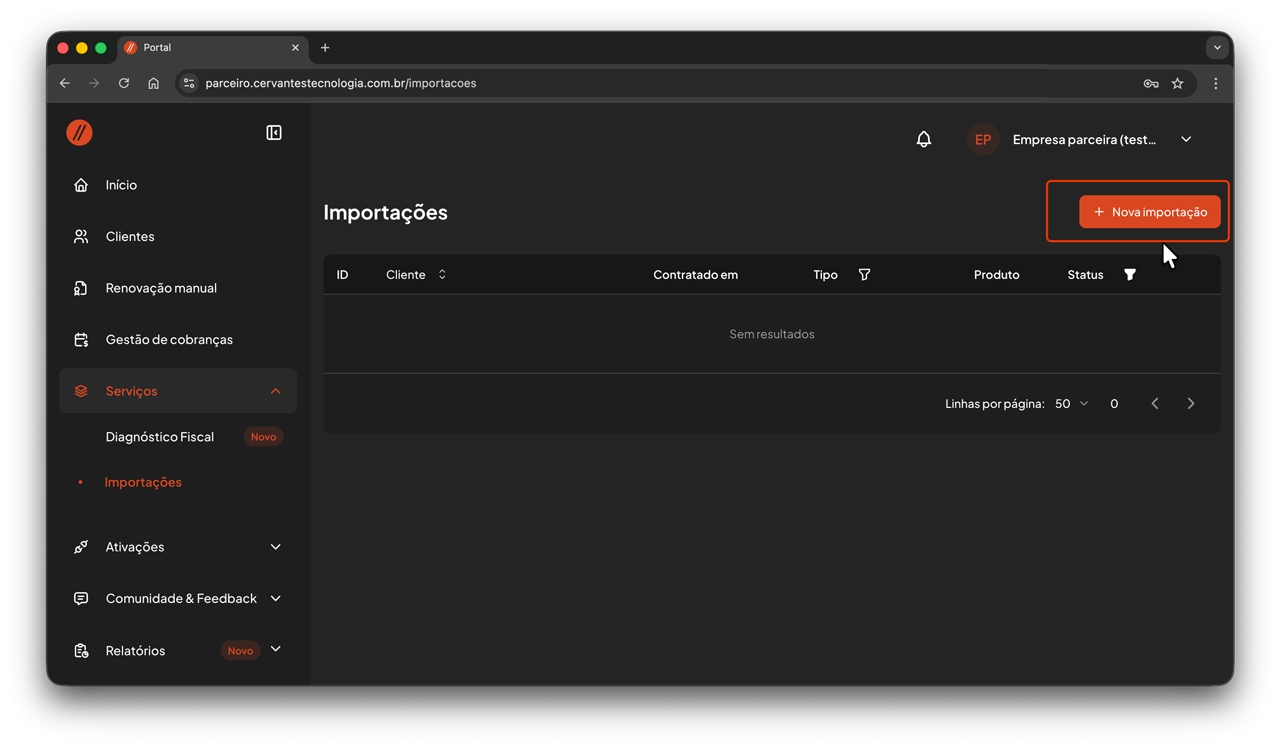 A solicitação de importação de dados é realizada no Portal do Parceiro.