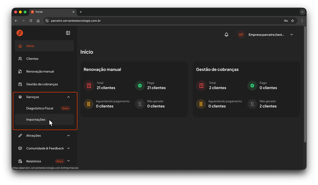 No menu lateral, expanda o item Serviços e clique em Importações.
