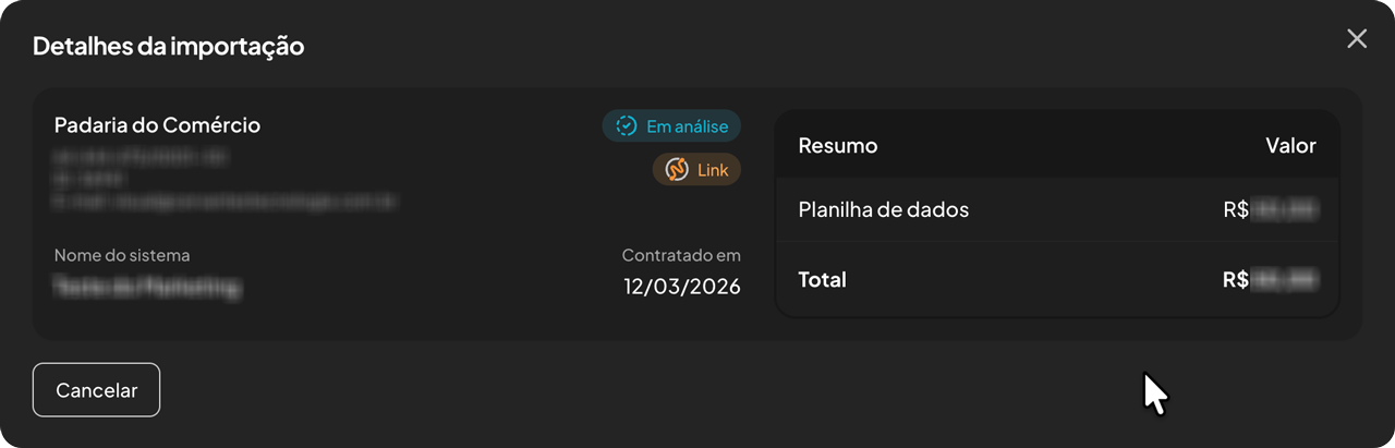 Na tela “Detalhes da importação” também fica a opção de Cancelar o pedido de importação.Importante: Você receberá um e-mail com o banco de dados quando a importação for concluída.