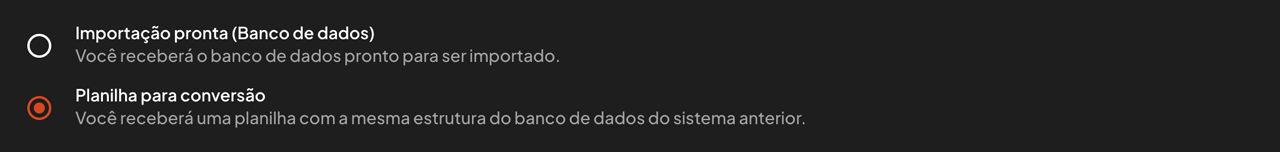 B. Planilha para conversão - Você receberá uma planilha com a mesma estrutura do banco de dados do sistema anterior.