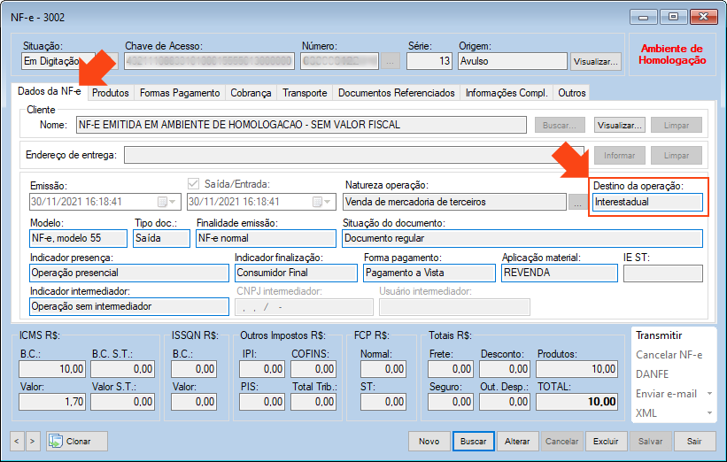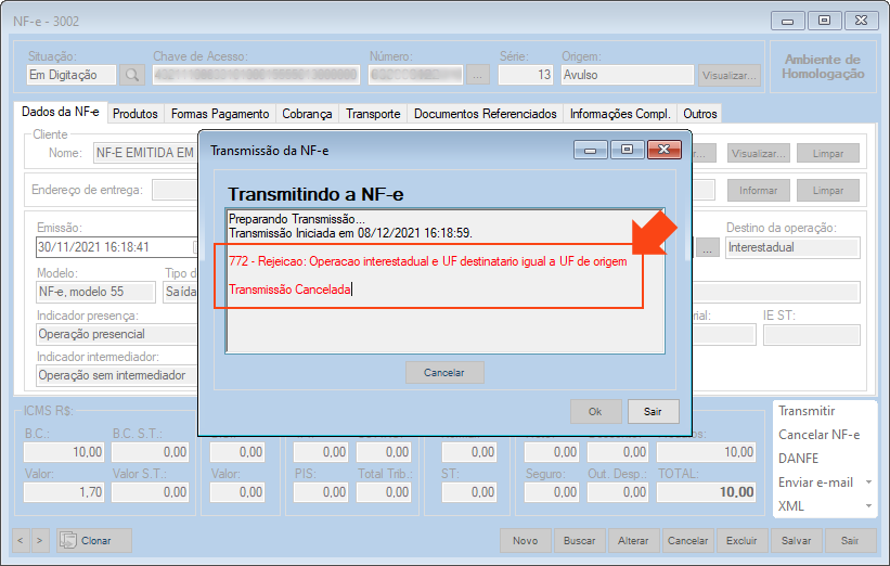 Causa: Ocorre quando a “UF do destinatário da NF-e” é a mesma “UF do emitente da nota”, porém o campo “Destino da operação:”, na aba “Dados da NF-e”, está selecionado como “Interestadual”.