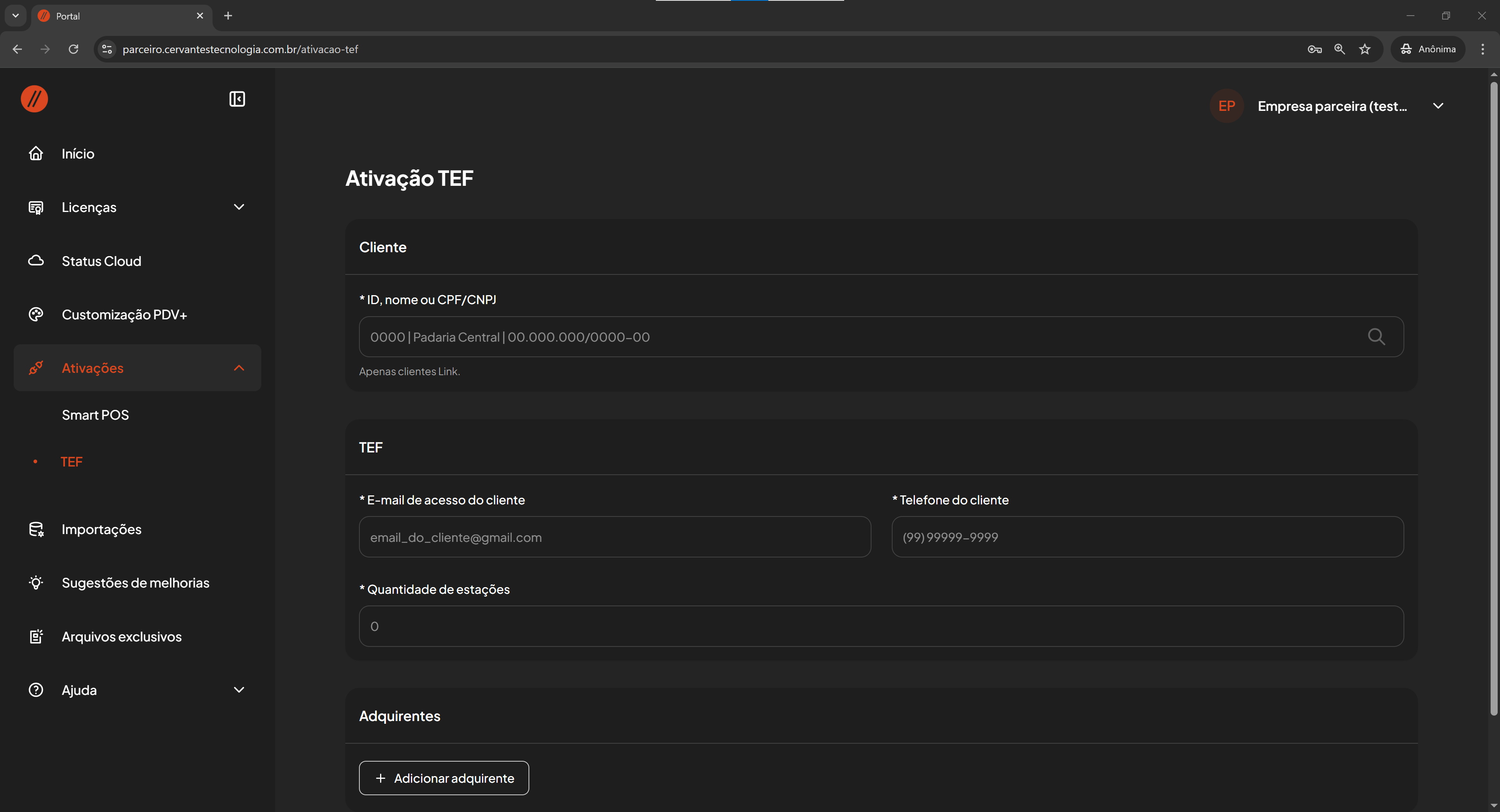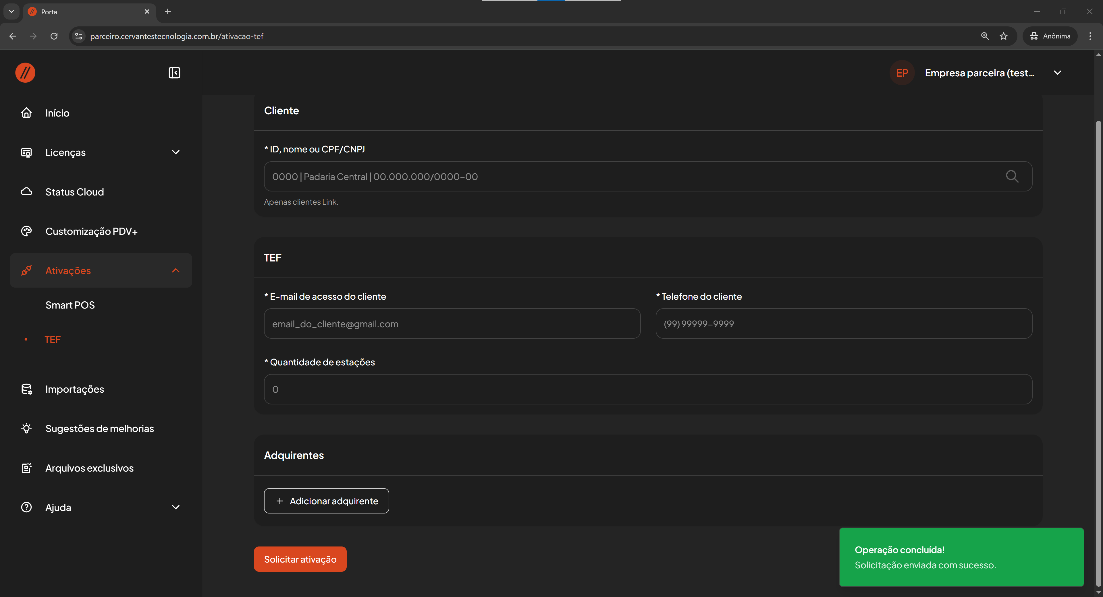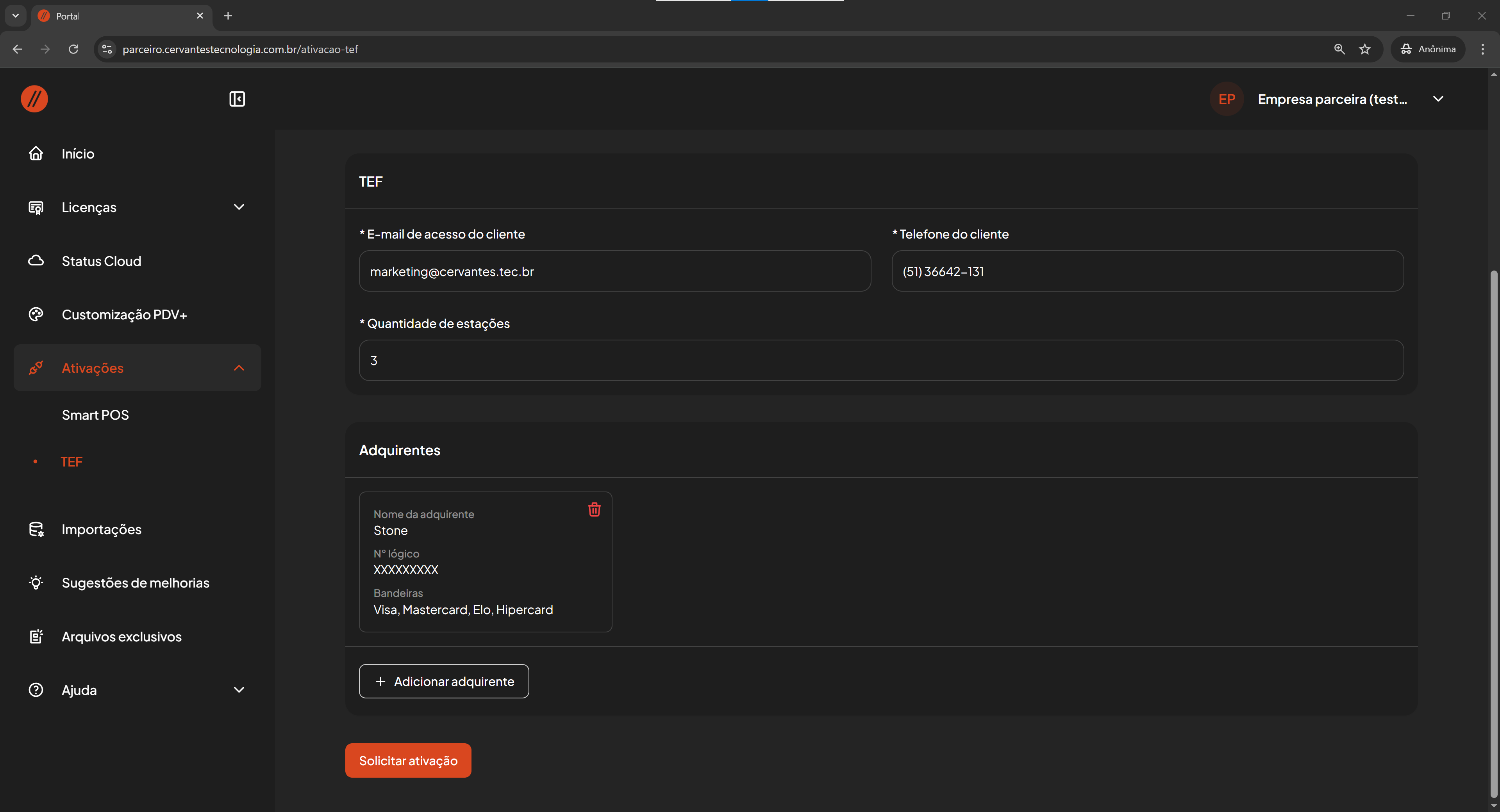 Solicitar ativação TEF no Portal do Parceiro