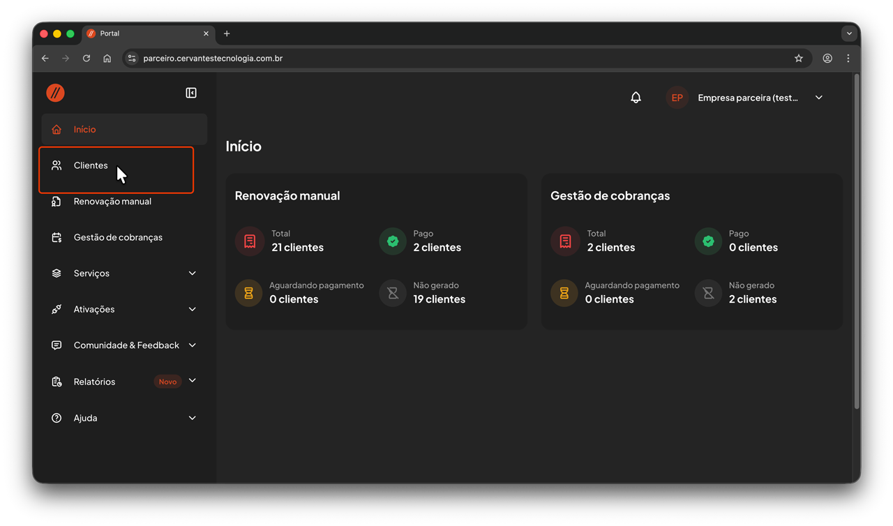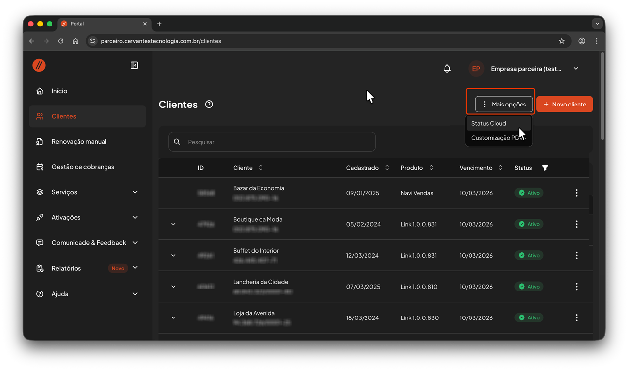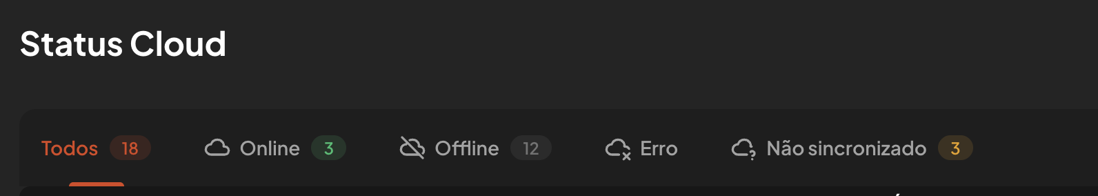 O Portal do Parceiro possui um menu chamado Status Cloud. Esta página mostra como está a conexão do cliente com nosso serviço Cloud.