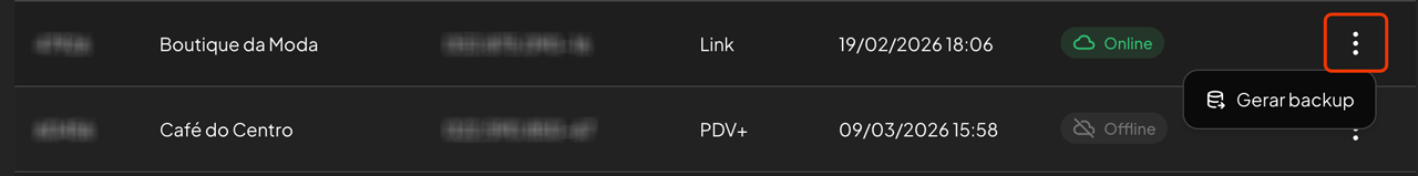Na linha de cada cliente você encontra um menu (três pontinhos) onde as opções variam conforme o sistema contratado.