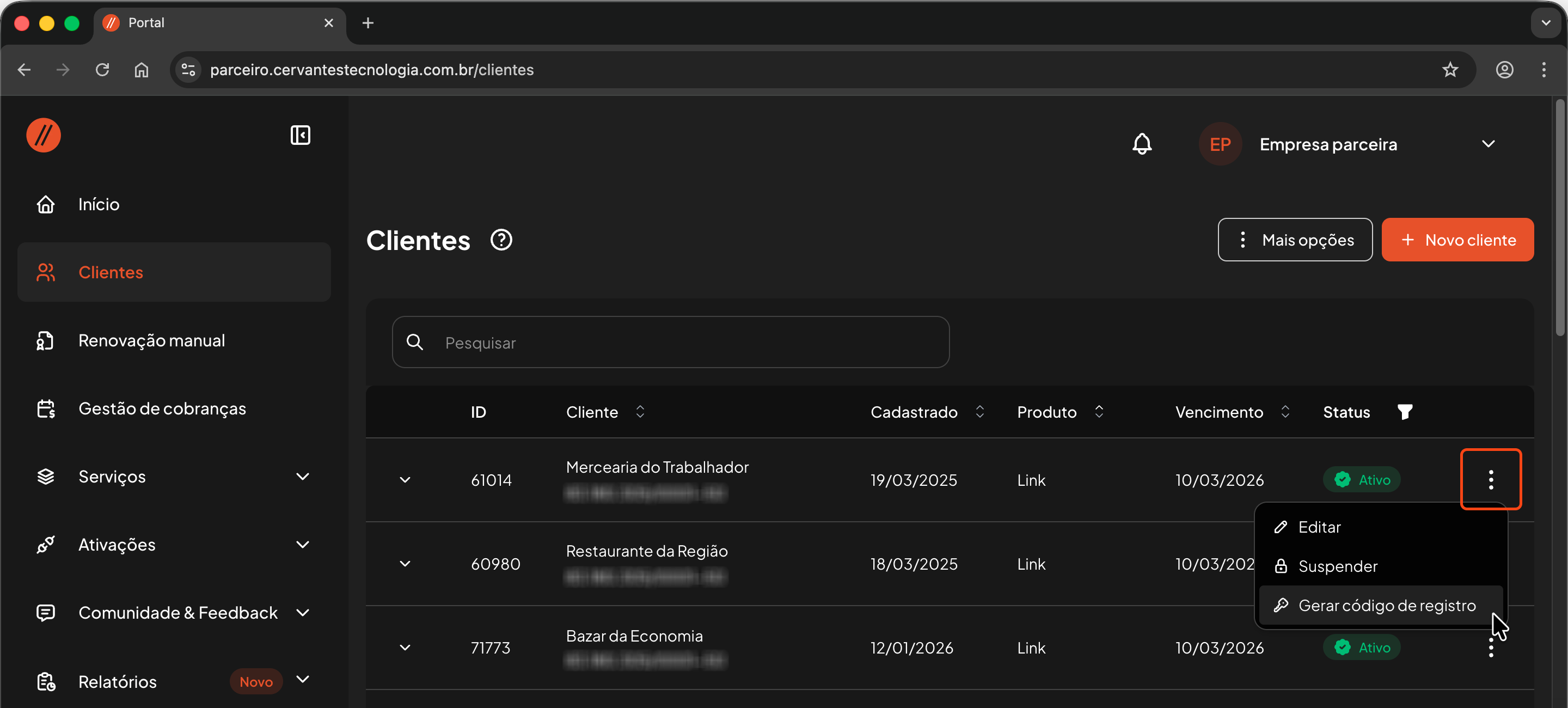 Observação: Você encontra o "Código de registro” nas informações do cliente no Portal do parceiro. Caso ele já tenha sido consumido, é possível gerar outro código clicando no menu (3 pontinhos) do cliente e escolhendo a opção Gerar código de registro.