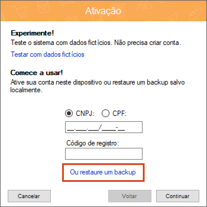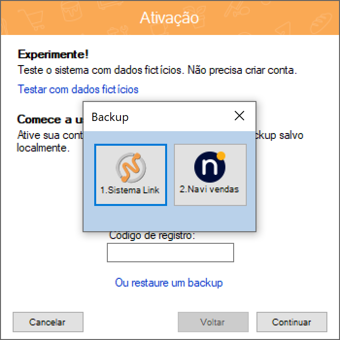 Na tela Ativação (imagem abaixo) apenas clique em Ou restaure um backup.