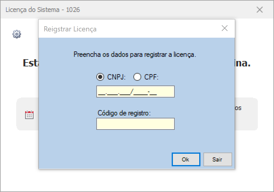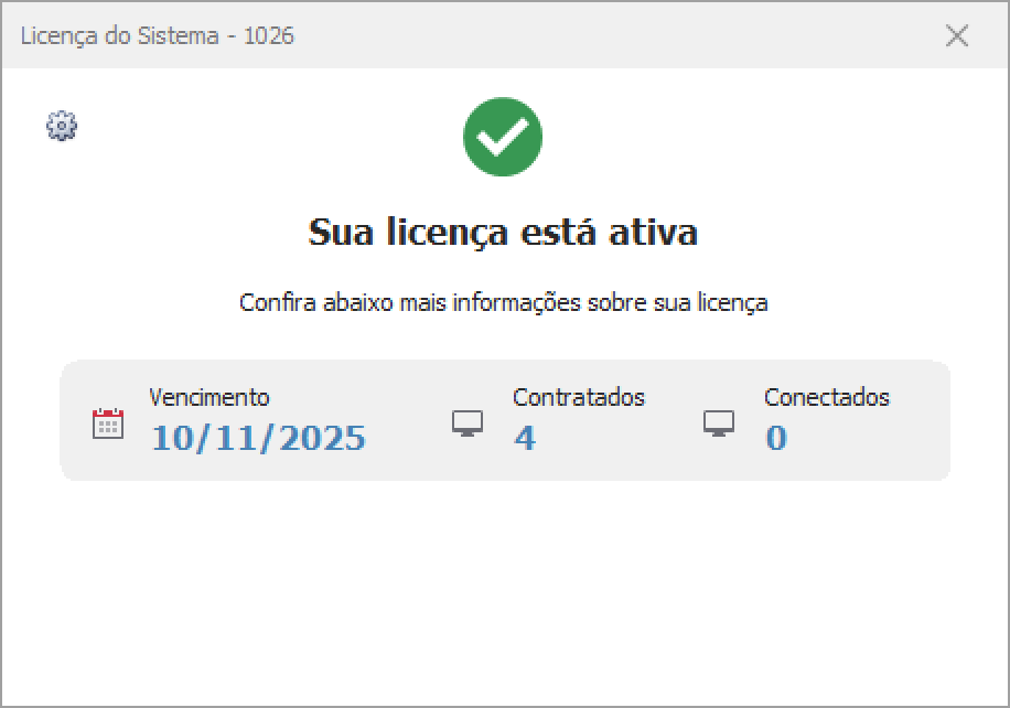 Observação: É possível acessar a qualquer momento a tela de Licenças do Sistema, código de acesso rápido “1026”, indo ao menu superior do sistema.