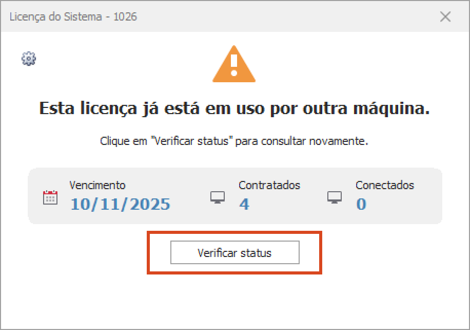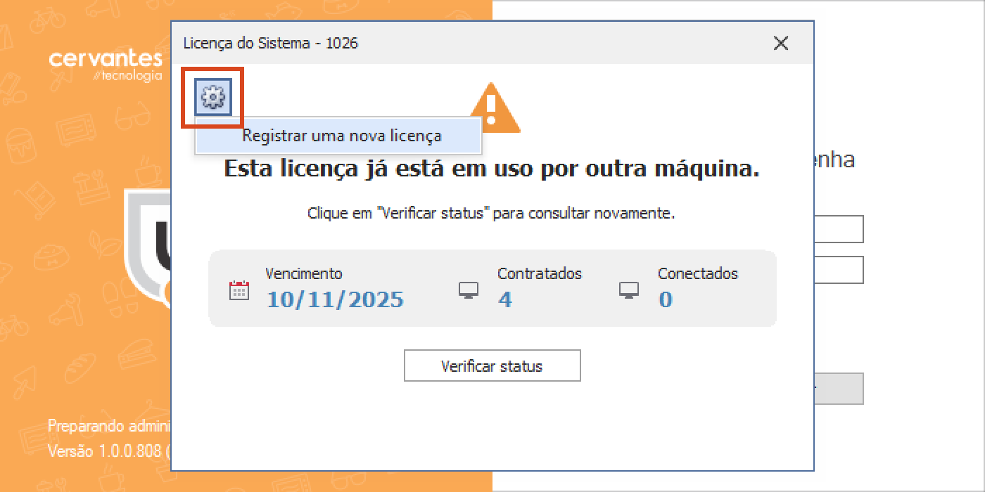 Se aparecer a mensagem informando que “Esta licença já está em uso por outra máquina”, clique no ícone de engrenagem para Registrar uma nova licença.