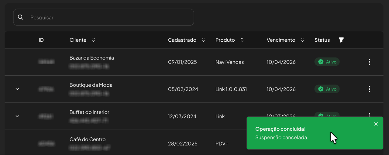 O status do cliente mudará para “Suspenso”.