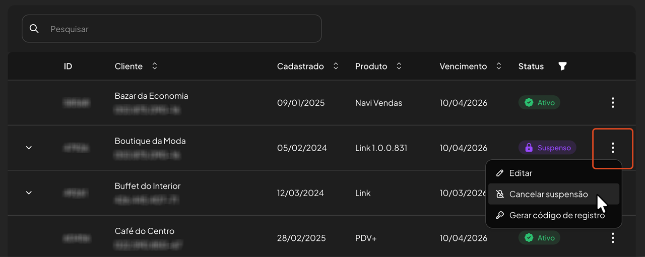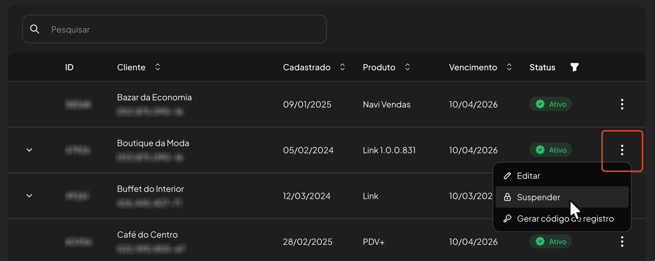 Na linha do cliente que deseja suspender o acesso ao sistema, clique no menu