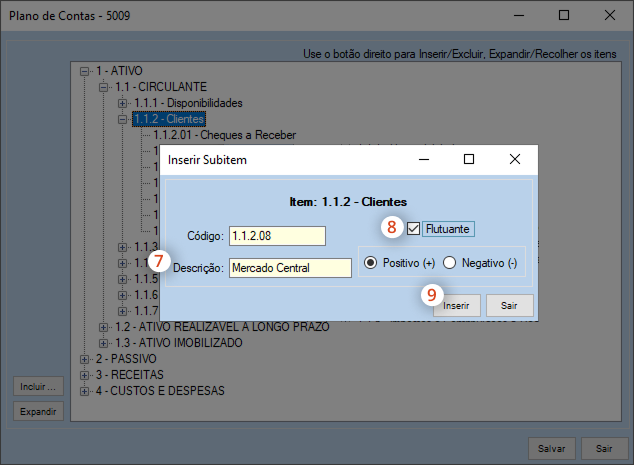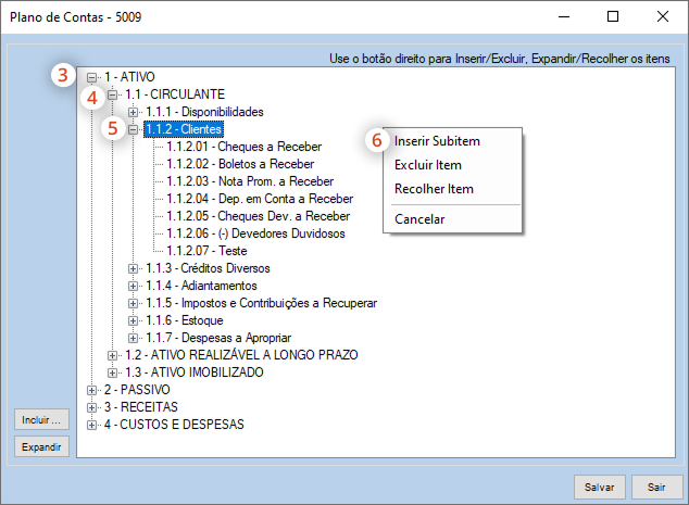 - Em “1.1.2 - Clientes”, clique com o botão direito e selecione a opção Inserir Subitem.