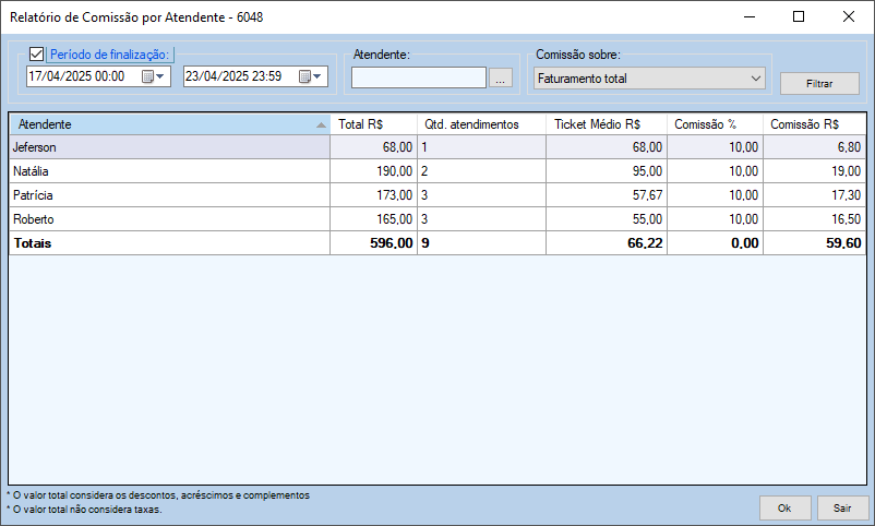 Relatório de comissão por atendente