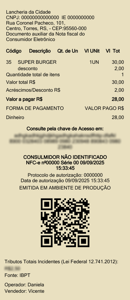 Se o sistema não trabalhar com nota fiscal, ao finalizar uma venda, será emitido um comprovante com as informações da venda.