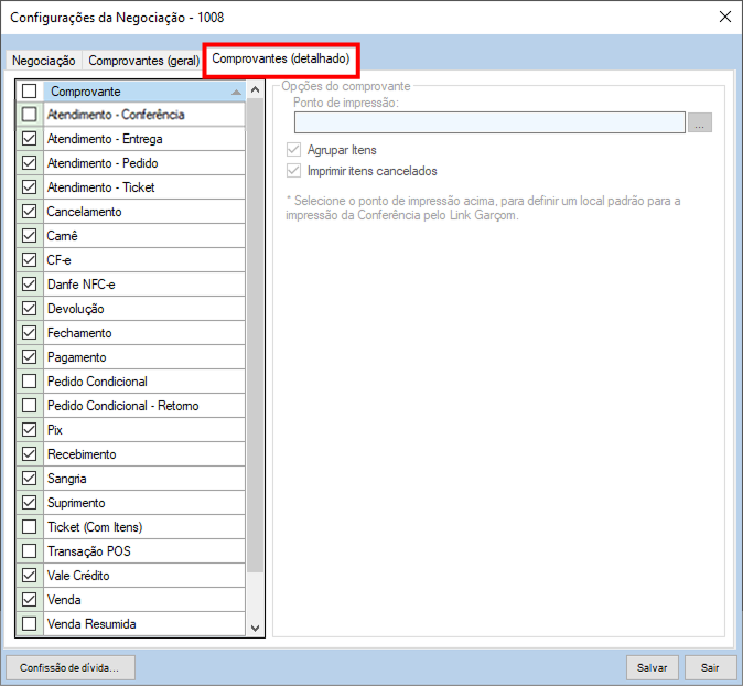 Ponto de impressão: São apresentados os pontos de impressão cadastrados na janela “Pontos de Impressão - 1030” para que o comprovante seja impresso.