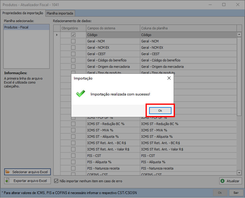 Novamente no sistema Link, vá para a janela Produtos - Atualizador Fiscal - 1041 (Administrativo>Fiscal).