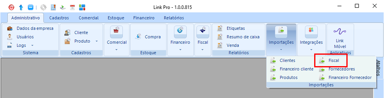- Dentro do sistema Link, vá para a aba Administrativo, clique em Importações e em Fiscal, código de acesso rápido 1041.