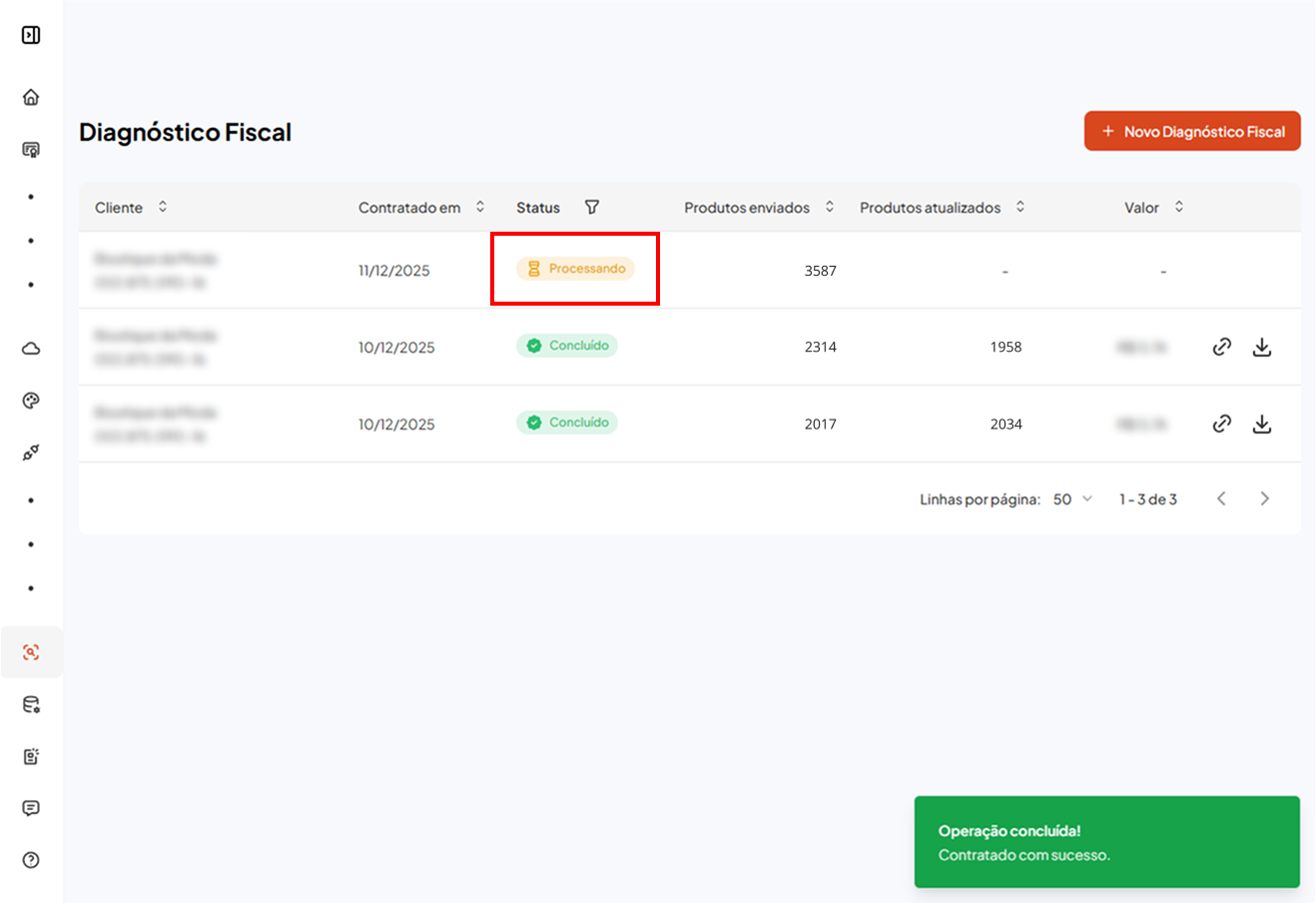 - Após contratar o serviço de Diagnóstico Fiscal, é necessário aguardar o processamento dos produtos, podendo variar conforme a quantidade de produtos existentes na planilha.