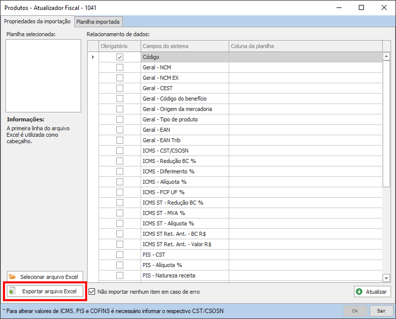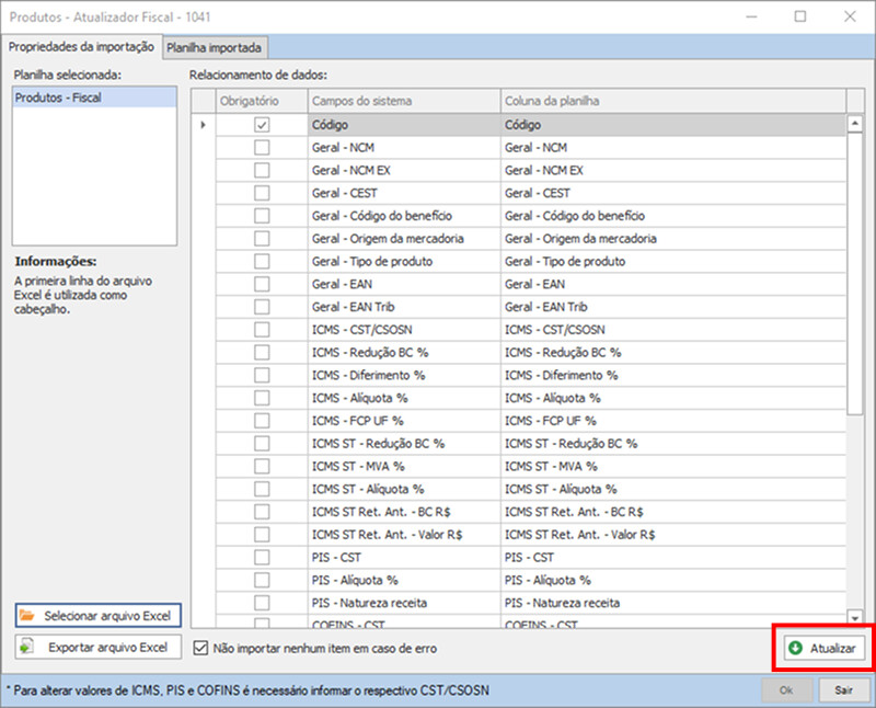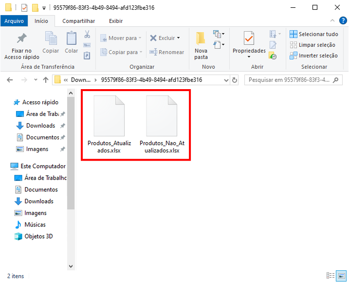 - Para atualizar os arquivos, selecione o arquivo Produtos_Atualizados.