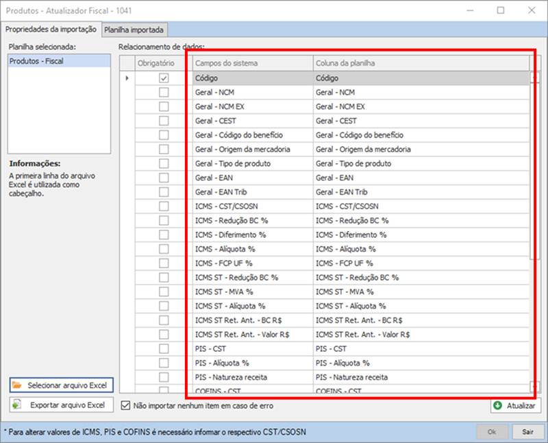 - Ao importar o arquivo, as colunas da planilha já serão automaticamente vinculadas aos campos do sistema.